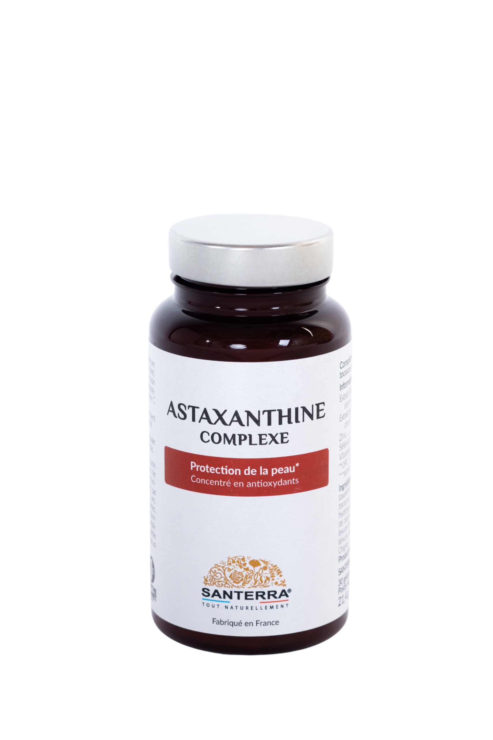 Nhựa dầu giàu Astaxanthin được chiết xuất từ tảo Haemotococcus pluvialis(1), áo: chất tạo gel hydroxypropylmethylcellulose, hạt nho(1) (Vitis vinifera), sợi keo, men (Saccharomyces cerevisiae) với selen, kẽm bisglycinate, vitamin C.